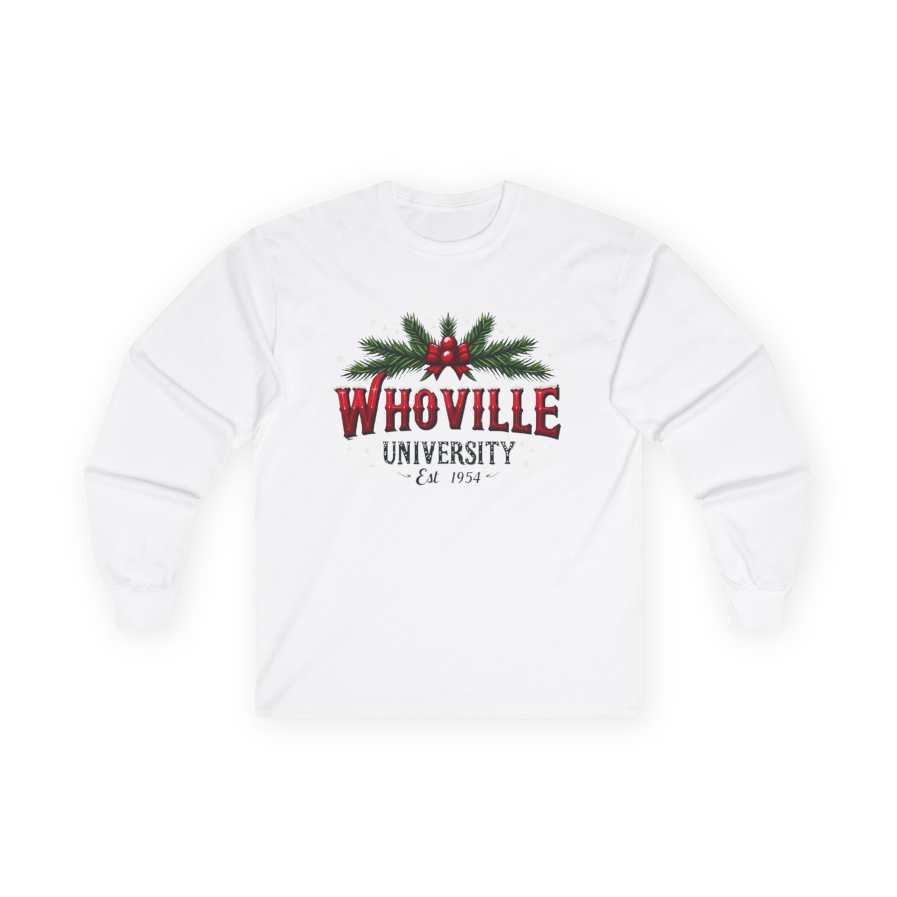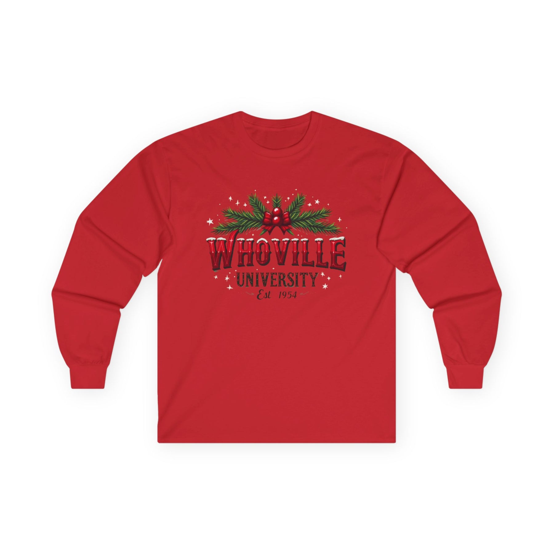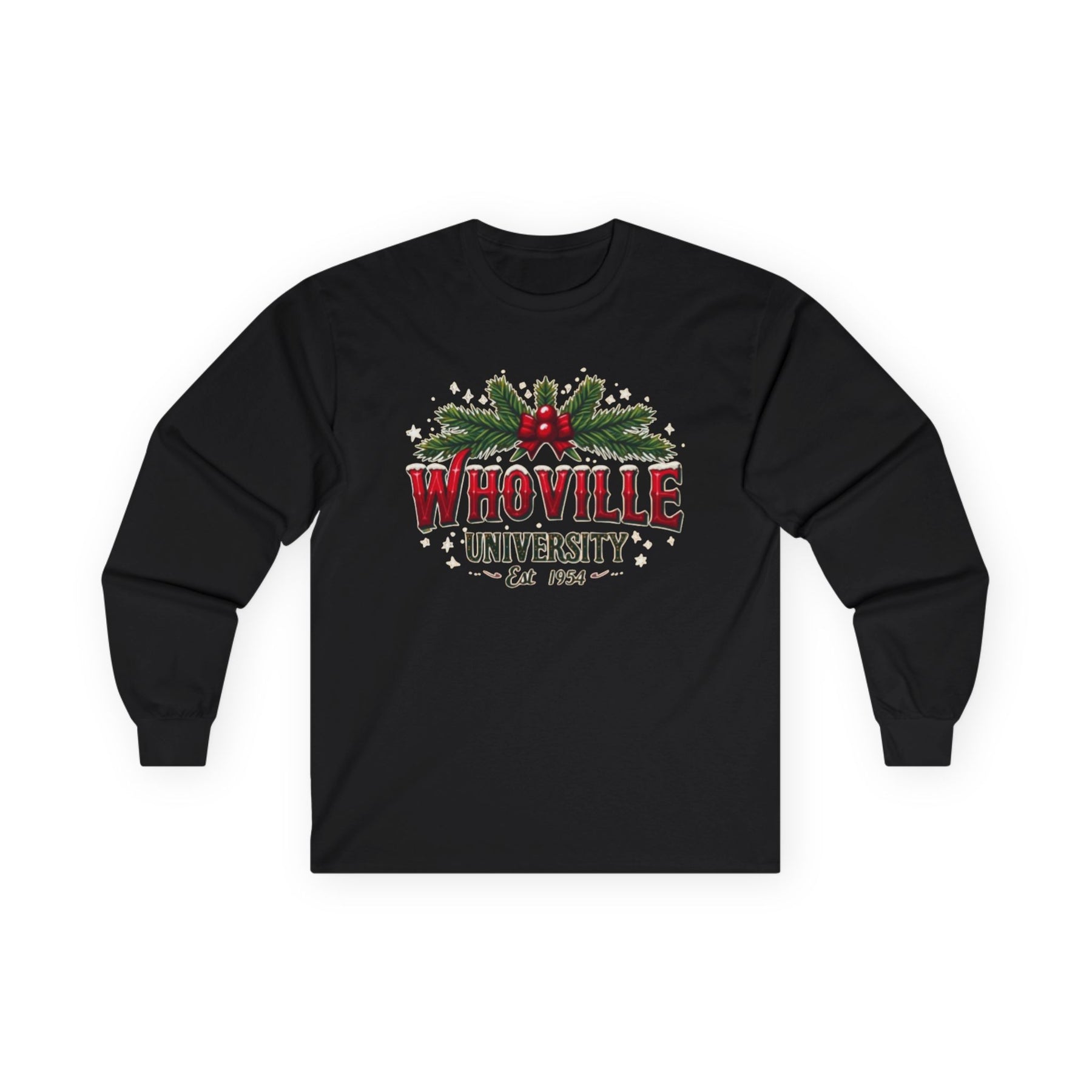 Playful vintage college lettering framed by festive greenery and a cheeky gingerbread emblem for a nostalgic storybook vibe. Soft long sleeve comfort perfect for holiday movie nights, festive outings, or gifting to fans of classic Christmas tales.