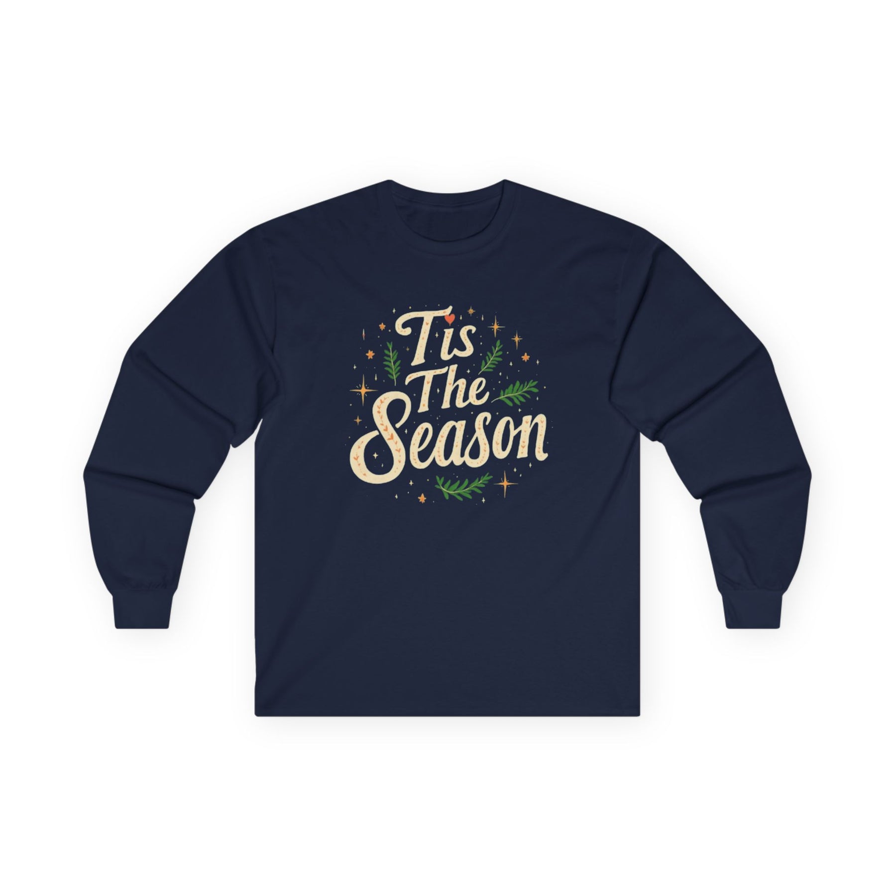Classic hand lettered script wrapped in festive greenery and twinkling stars for a warm seasonal vibe. Soft long sleeve comfort perfect for family photos, holiday markets, or cozy nights in.